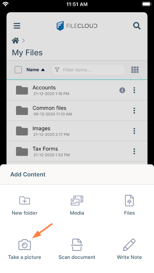 While you are working in the FileCloud iOS app, you can take a picture and add it to FileCloud as a .jpg file.