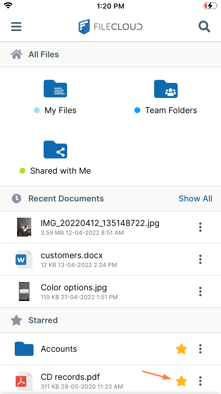 You can star your favorite files and folders in FileCloud. The Starred folder appears on the dashboard. You can also access it by tapping Starred in the navigation pane.