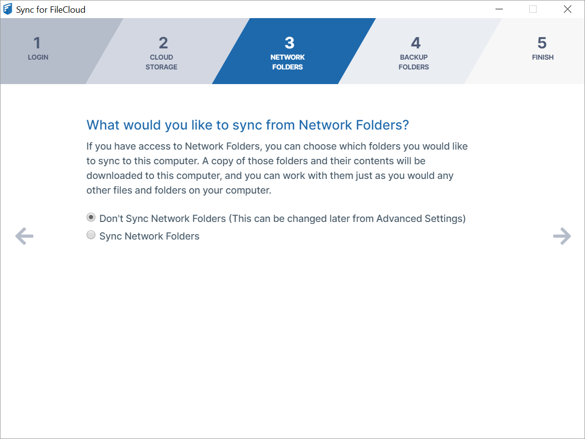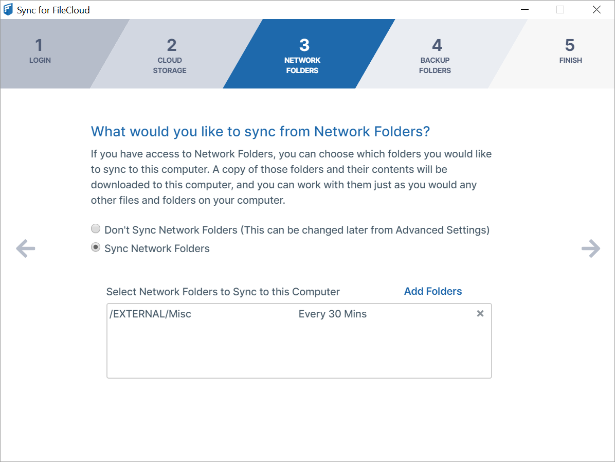 For information about editing settings for syncing network folders, and for additional configuration for remote delete, see Sync Network Folders for Offline Access. - Click the arrow to go to Step 4, Backup Folders.