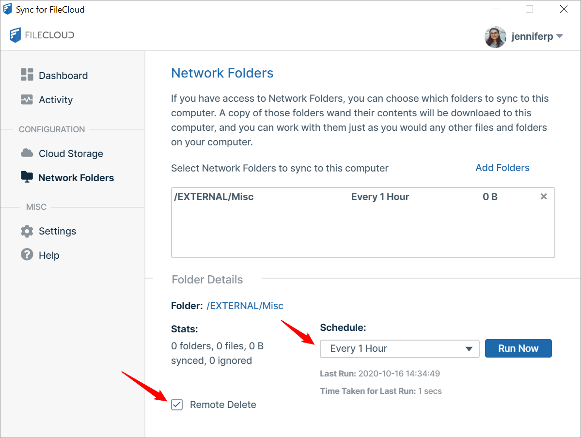 - Check Remote Delete if you want to sync delete operations for the Network Folder's files. If you do not check Remote Delete, when a file is deleted in Sync's content explorer folders, it remains in the network location after syncing.