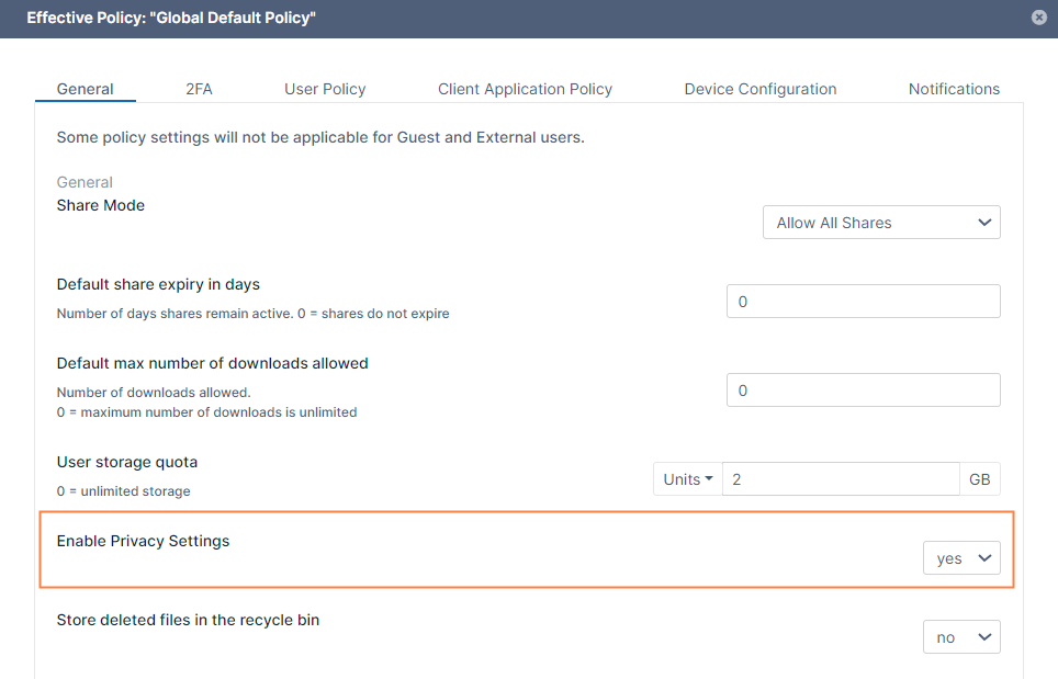 If Enable Privacy Settings in the General tab of a user's policy is set to yes, you can require users who log in to public and password-protected shares to accept FileCloud terms of service by adding text to the Anonymous User Consent Dialog Text field.