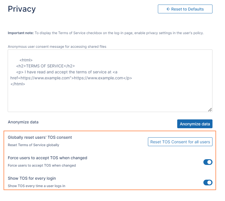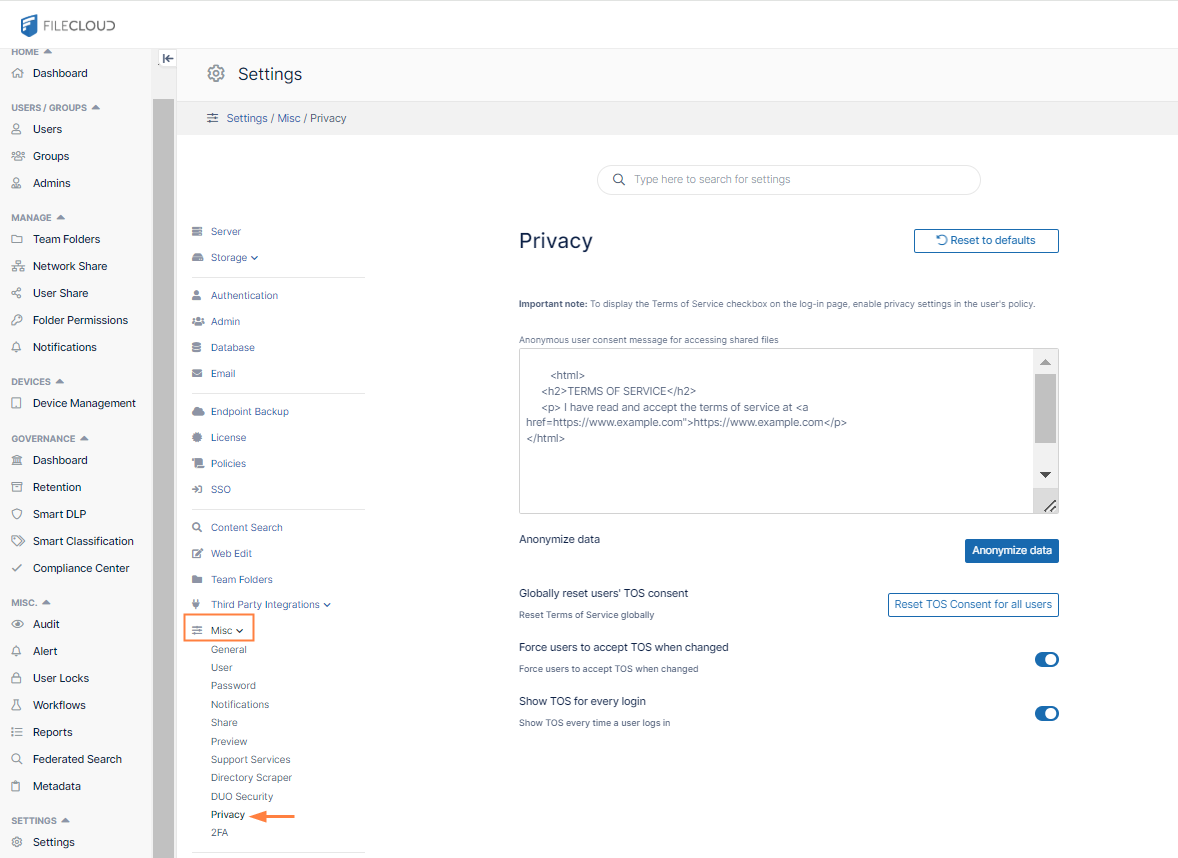 In versions of FileCloud prior to version 20.2, the fields Globally reset users' TOS consent, Force users to accept TOS when changed, and Show TOS for every login appear in the Customization > TOS tab. Now these fields appear in the Settings > Misc > Privacy tab.