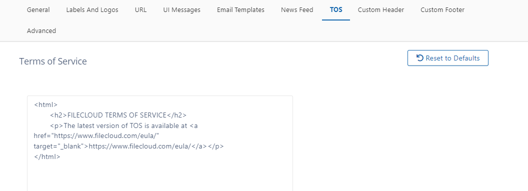 Beginning with FileCloud Version 22.232, the default link to FileCloud terms of service has changed to https://www.filecloud.com/eula/. The link will only be changed automatically on new installations of FileCloud. Although the previous link will automatically redirect users to the new page, if you are upgrading FileCloud to version 23.232 or using an earlier version, we recommend that you change the link in Customization > TOS to https://www.filecloud.com/eula/