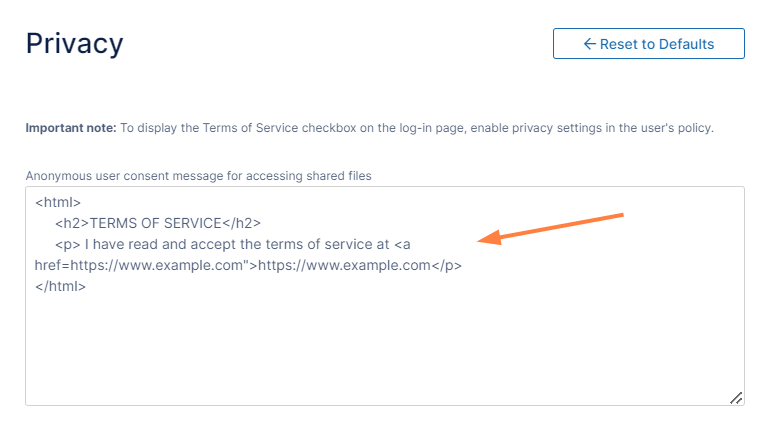 To enter new terms of service, change the HTML code in Terms of Service. Note: This text is not shown when users open a public or password-protected share; instead the text in Anonymous user consent message for accessing shared files in Privacy settings page, if it is entered, is shown.