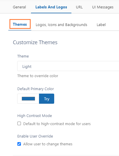 When checked, users can override your default theme and color settings with the same preset themes, high contrast option, and primary color choices that are available to you.