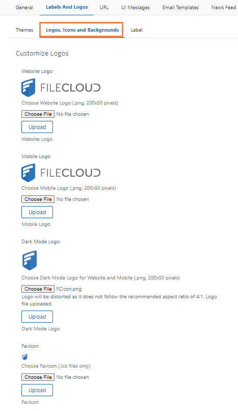 To change logos in your FileCloud site, click the Logos, Icons and Backgrounds tab.