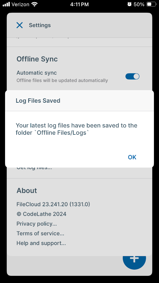 A message confirming that your log files have been saved to Offline Files/Logs appears.