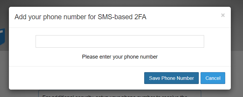 If users are required to use SMS with 2FA, they will see the following dialog box during login after the policy is enabled: