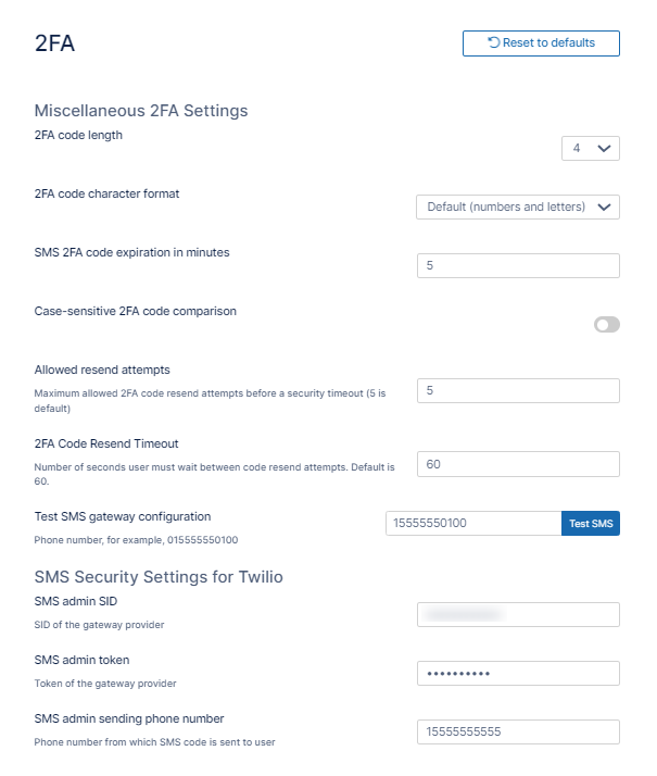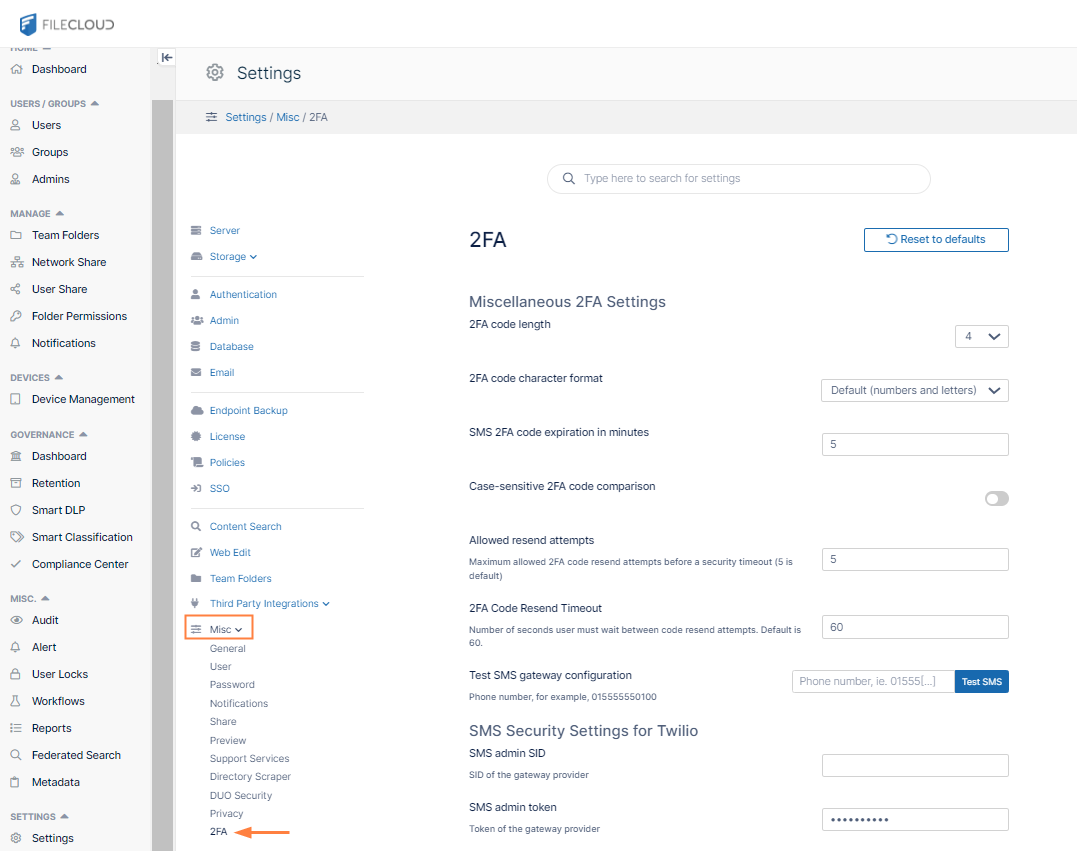 Follow instructions at https://www.twilio.com/docs/sms to obtain the required SID, Auth Token and create a phone number. - In the FileCloud admin portal, open the 2FA settings page.