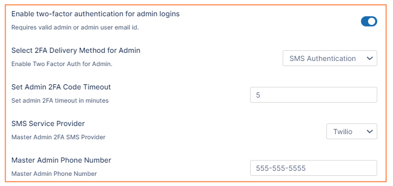 In Master Admin Phone Number, enter the admin's SMS phone number. An invalid master admin phone number will cause lockout - the portal will not be accessible when SMS Authentication is chosen.