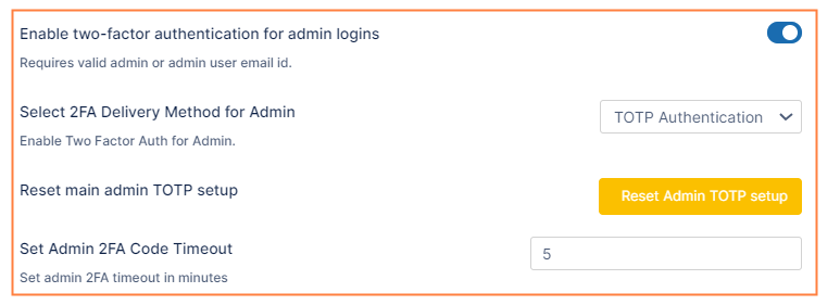 When you select TOTP Authentication for the 2FA delivery method, the setting Reset Admin TOTP setup appears below it. If the primary admin loses their TOTP-enabled device or needs to reset the TOTP authenticator code for another reason, a promoted admin with Settings read and update role privilegescan click Reset Admin TOTP setup to enable the admin to reset their authenticator code.