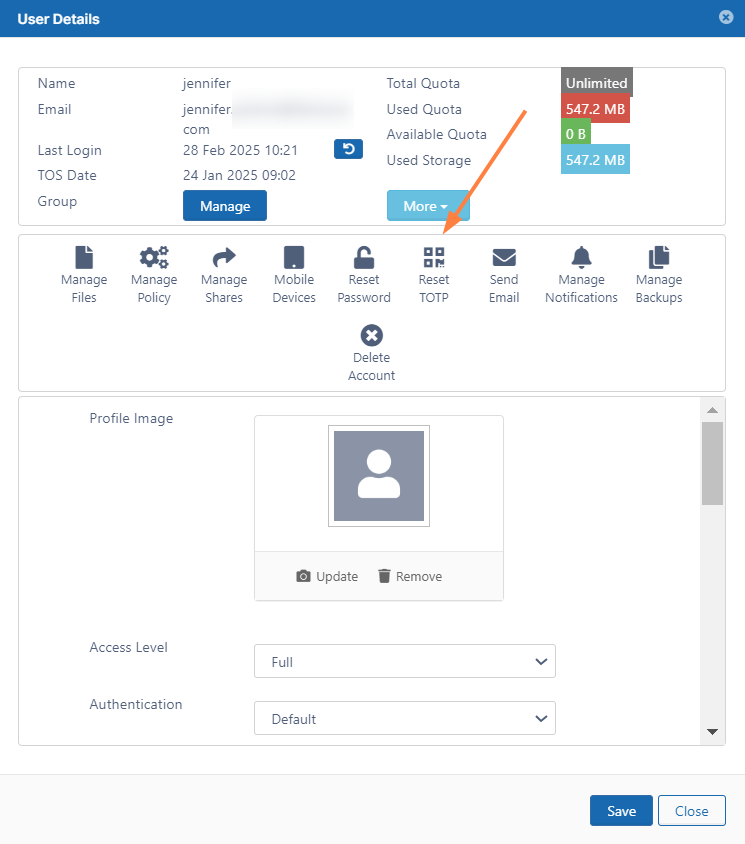 When TONIDOCLOUD_2FA_ADMIN_FLOW_FOR_PROMOTED_ADMINS is set to 1, a promoted admin's TOTP settings cannot be reset through their user account or through the Reset Admin TOTP setup button discussed above. Instead, a new button appears on the User Details window accessed from the admin portal's Manage Users page.