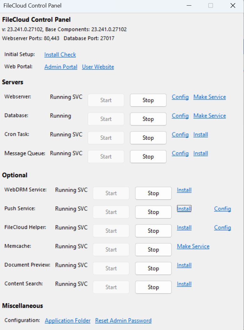 Beginning in FileCloud 23.241, before running the upgrade tool, confirm that each of your FileCloud services is running and that your storage is in a READY state. This is a change from previous version upgrades, in which you were instructed to confirm that each of your FileCloud services was not running.