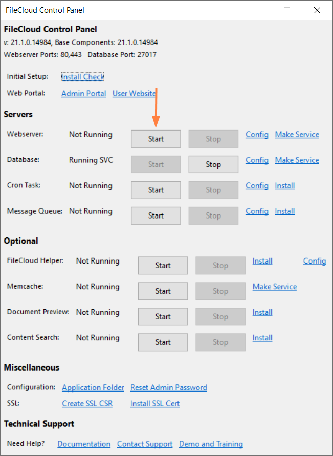 Open the FileCloud Control Panel and confirm that each service you are using is running, and that your storage is in the READY state.