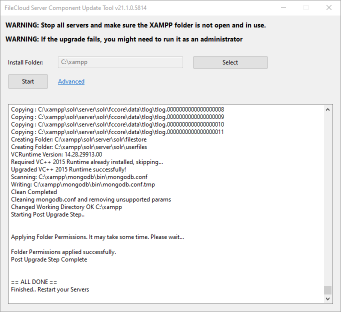 Click Start on the Update Tool dialog box to begin the upgrade. (Repeat steps 1-3 for each of the nodes for HA system). The tool must be able to connect to the internet in order to download the update package. Please contact support@codelathe.com if you see any errors in this step.