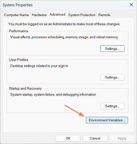 In the System Properties dialog box, click Environment Variables. The Environment Variables dialog box opens.