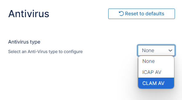 In Anti-Virus Type, choose Clam AV. Clam Antivirus settings appear.