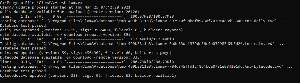 The virus database definition can be updated using freshclam using a Windows task scheduler.