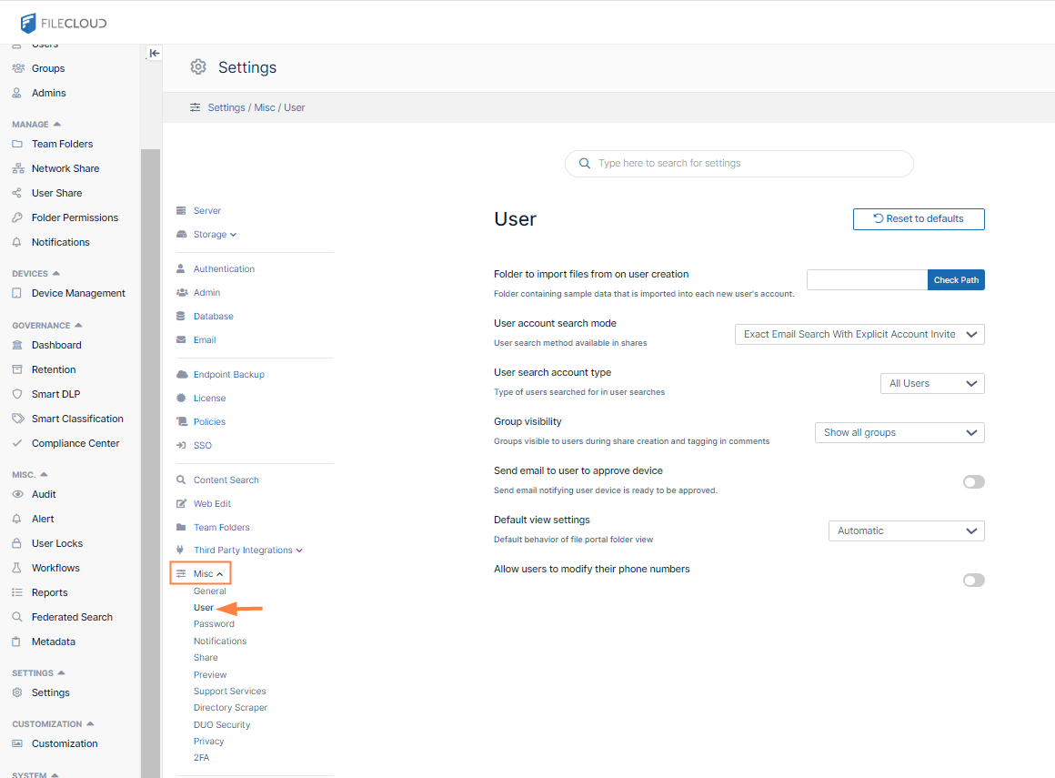 Search Mode Example When this search mode is set by admin, the following behavior will be seen during sharing by users: Exact Email Search With Explicit Account Invite JoeCarpenter@MyFileCloud.com - Only email search is allowed