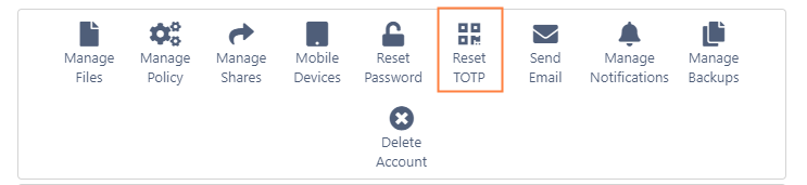 A Reset TOTP button is included for admin users if a setting is included to configure their 2FA to use the admin configuration if the admin 2FA delivery method is TOTP. When the setting is included, the admin users' TOTP authorization cannot be reset by the given methods for users and the main admin, and must be reset using this button. For more information about the setting, see Two-Factor Authentication for Admin Portal.
