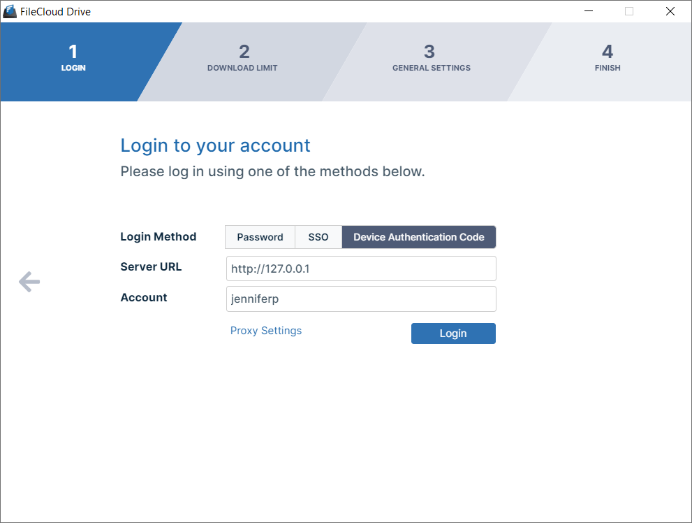 - In the Login screen of the Drive wizard, for Login Method, click Device Authentication Code.