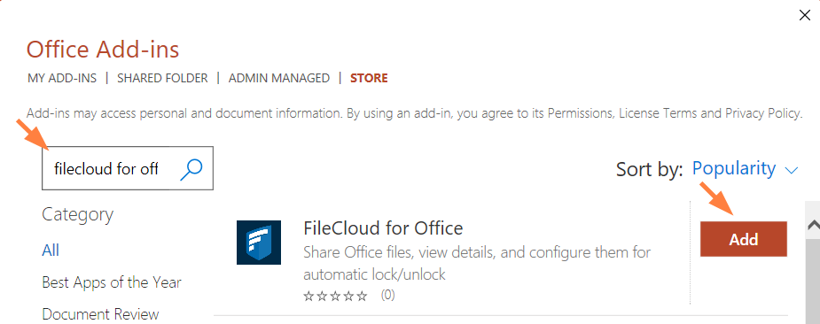 3. In the Office Add-ins search box, enter FileCloud for Office and click Enter.
