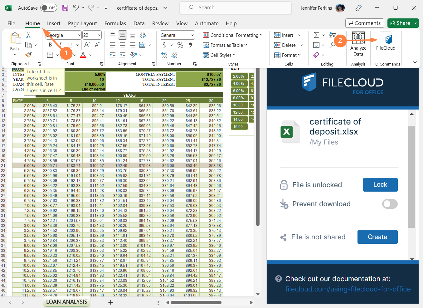 A panel showing FileCloud for Office opens on the right.