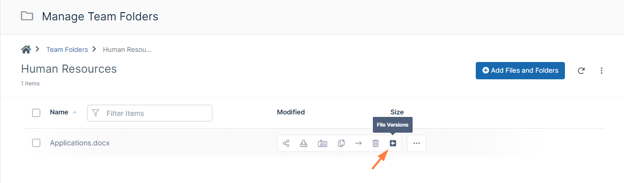 - On the Manage Team Folders page, navigate to the file you want to revert to a previous version.