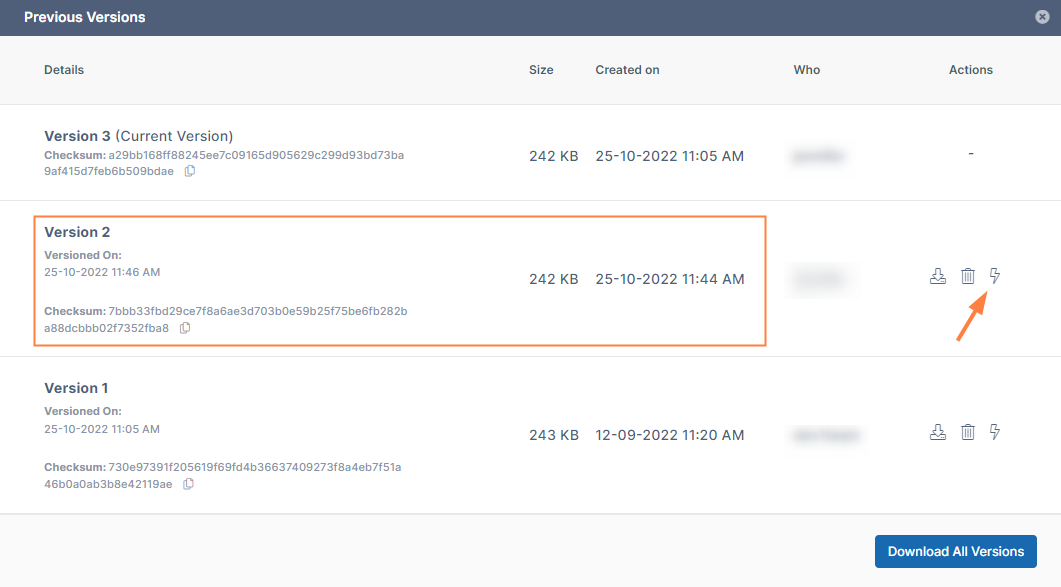 The version that was made the current version now appears at the top, and the previous current version appears under it.