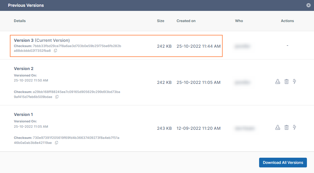 In versions of FileCloud prior to 20.2, current versions are always removed when another version is restored. Beginning with Version 20.2, by default, the current version is saved when another version is restored.