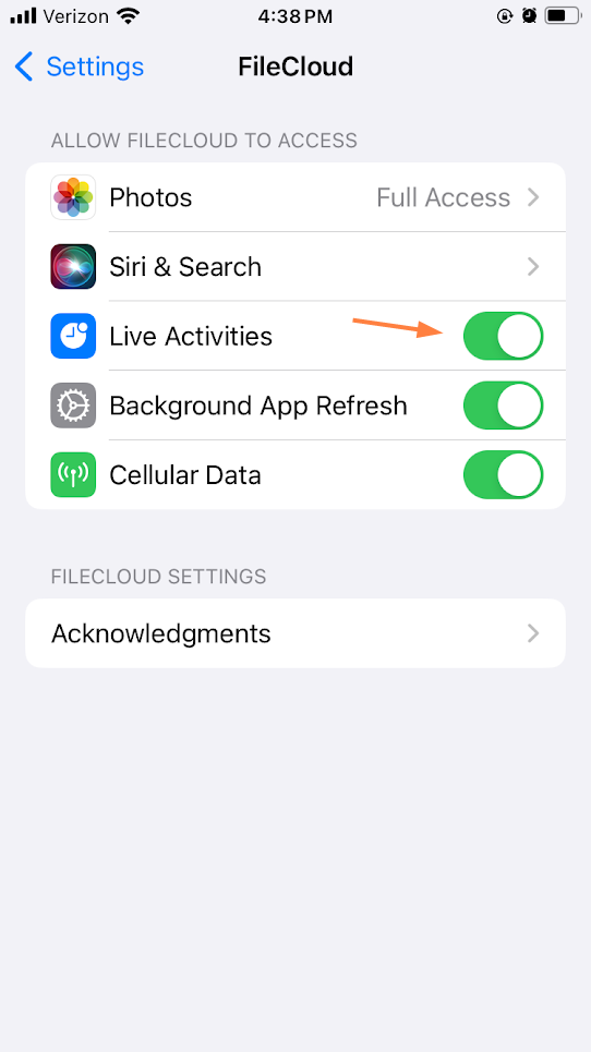 You can also go to your iOS settings and click the FileCloud icon to view FileCloud access settings. From there, toggle the Live Activities slider to show/not show FileCloud live activities on your lock screen.