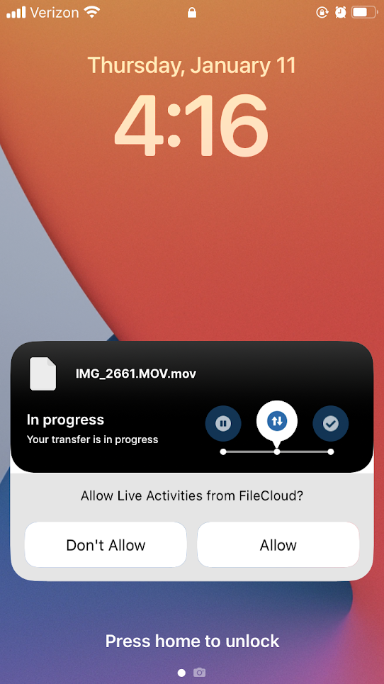 If you don't want to show FileCloud live activities on your lock screen, click Don't Allow.