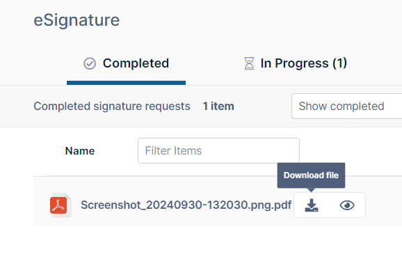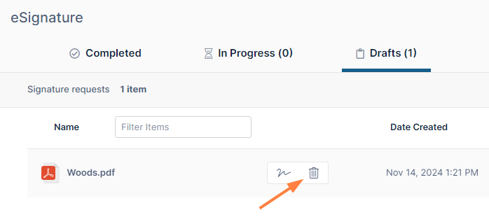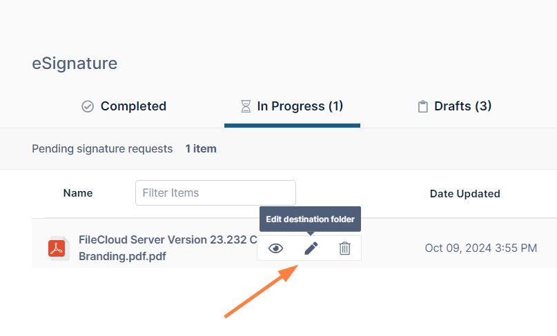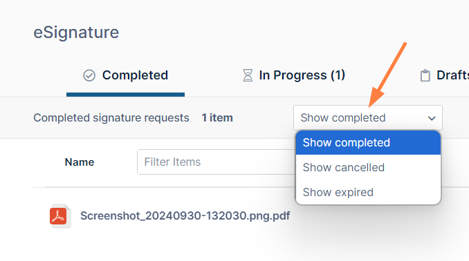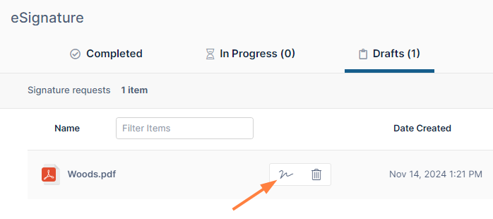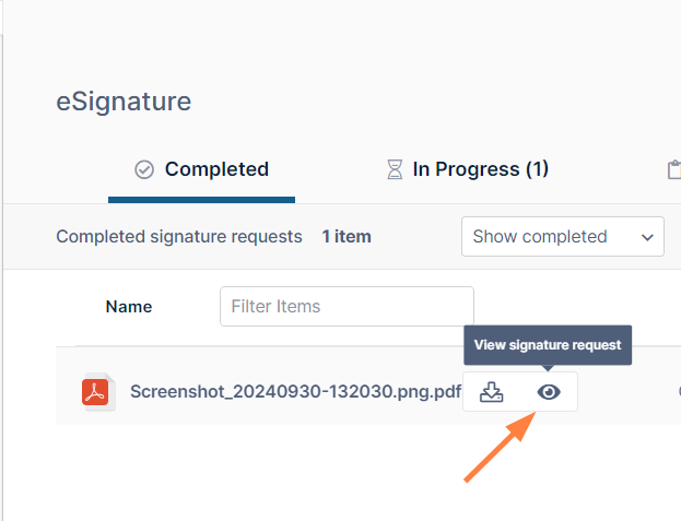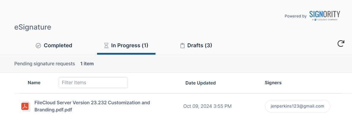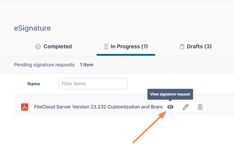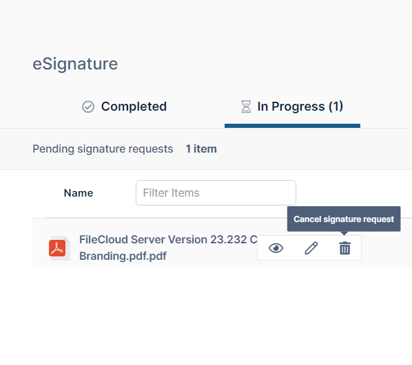 The In Progress tab shows eSignature requests that have been sent to signers but have not yet received all of the required signatures.