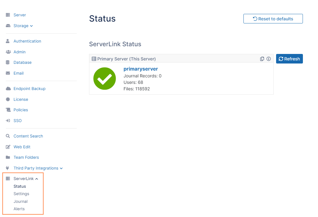 In the FileCloud admin portal's left navigation bar, scroll down and clickSettings.Then, on theSettingsnavigation page, clickServerLink . The ServerLinkStatuspage opens by default.