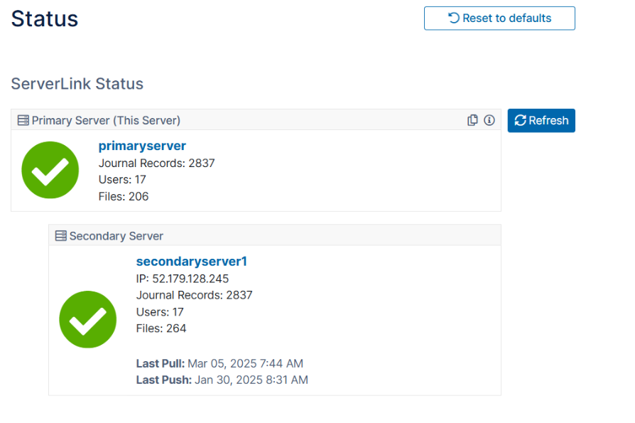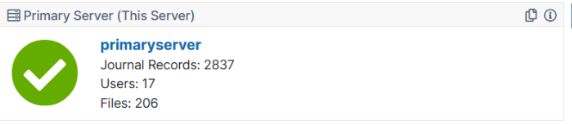 The Status page displays information about the primary server and each of its secondary servers. The following images display a configuration with one primary server and one secondary server; if there were additional secondary servers, boxes representing each of them would also appear for them in the images.