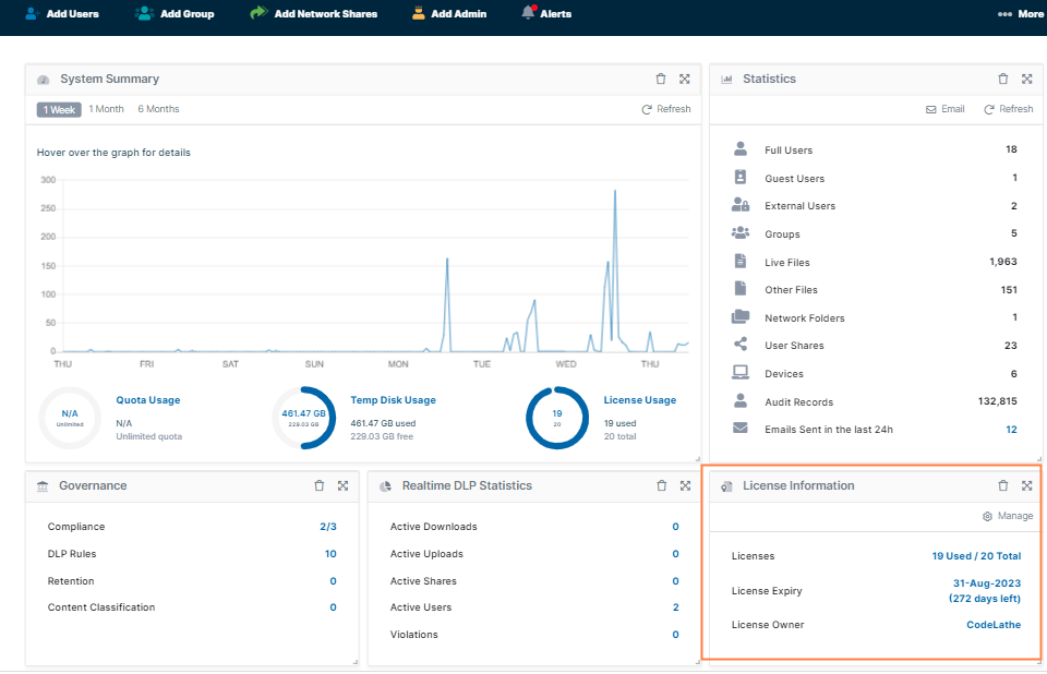 The Admin portal dashboard - Use this to see quick details about your license, such as when it expires.