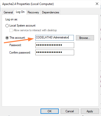 - Open the Windows Services panel, then access the Apache service (the name may include the version of Apache installed).