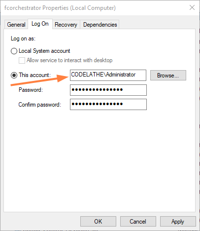 - Restart the service. Now fcorchestrator is running as a user account with full access to the network share.