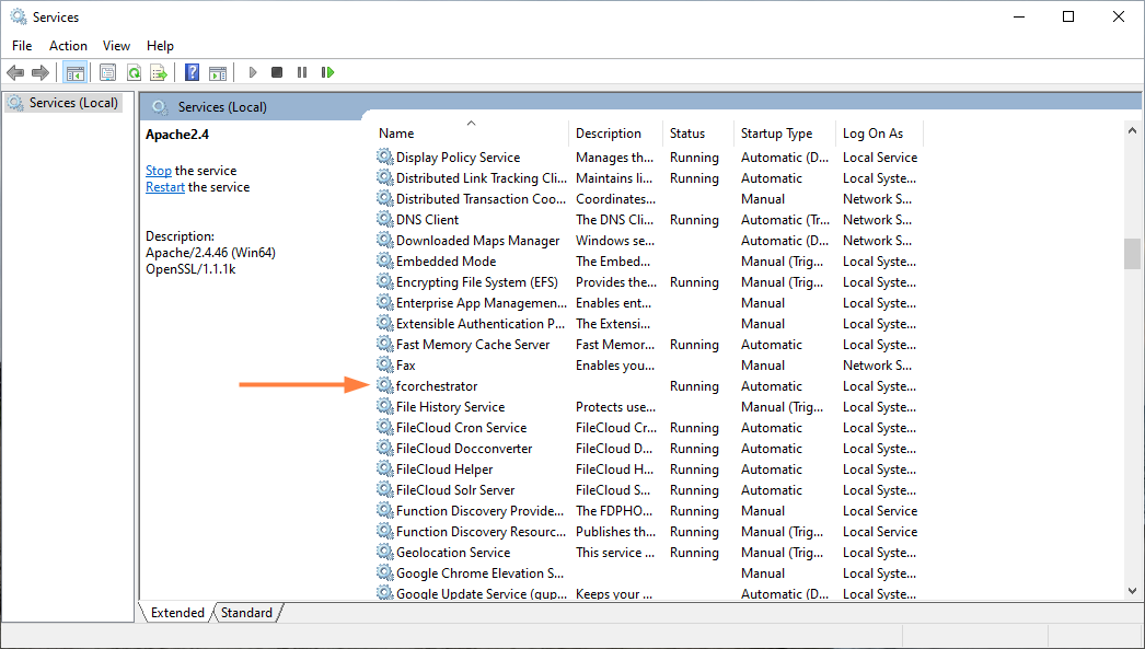 - Open the Windows Services panel again, and access the fcorchestrator service.