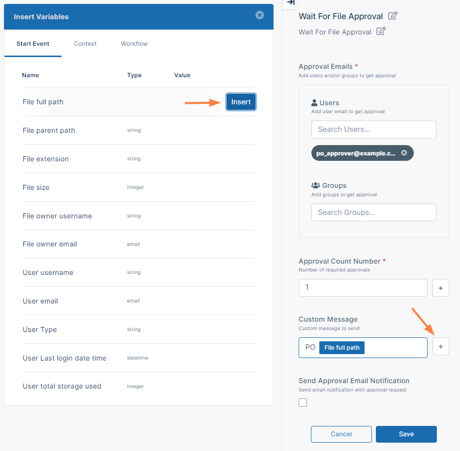 In Custom Message, enter a message that tells the PO Approver that a file is awaiting action. The PO Approver will receive this notification in their user portal with other notifications. It will be helpful if users who read the message can see the name of the PO file it refers to, so we'll add a variable with the filename to the message, which will read PO <filename> has been added to the "PO In" folder and is waiting for you to approve or reject it. Begin typing your message, and when you reach the point at which you want to insert the variable, click + next to Custom Message to open the Insert Variables box. Hover over File full path and click Insert. The variable is inserted into Custom Message and will appear as the file path and name when the message is displayed. Then complete typing the message.