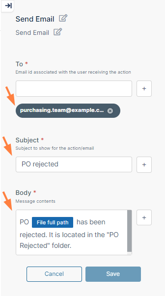 In To: Since the user who submitted the PO could be anyone in the Purchasing department, enter the group email address for the Purchasing team. If there were only one user who added PO's, you could add that user's email.