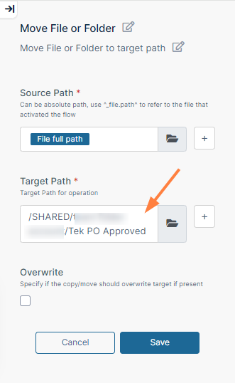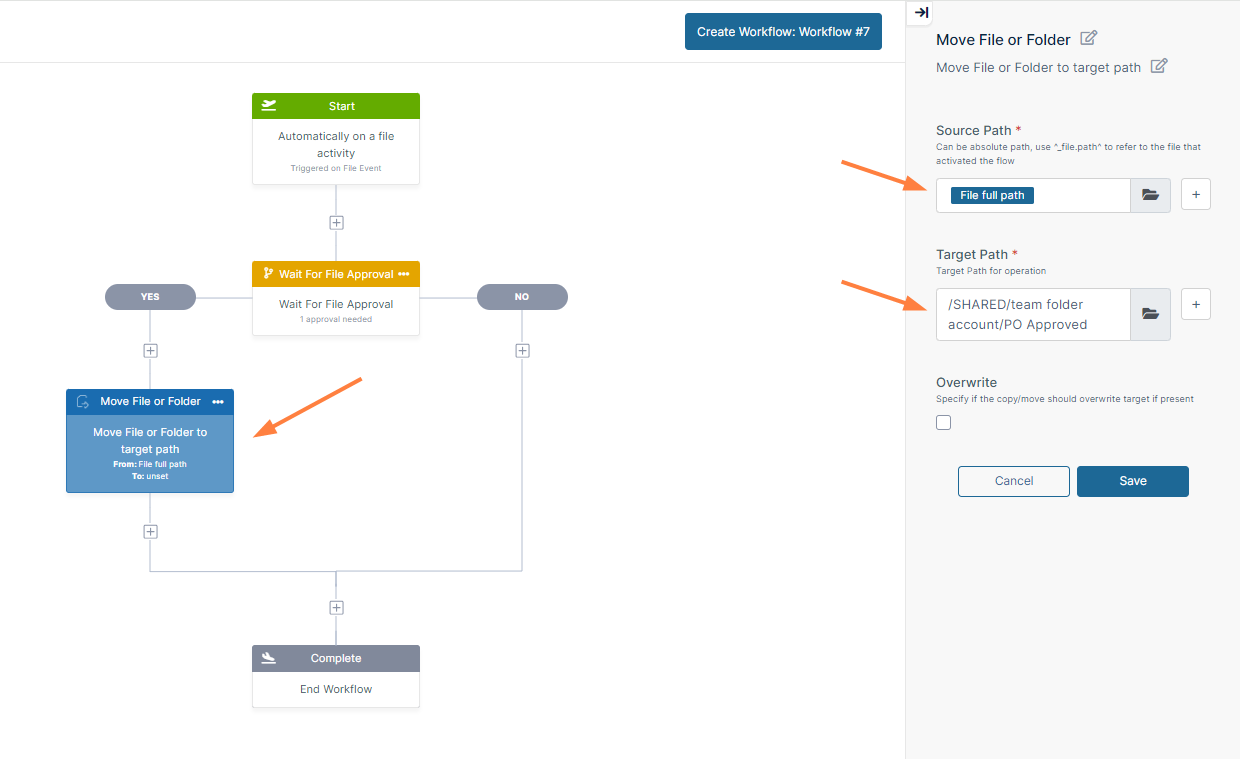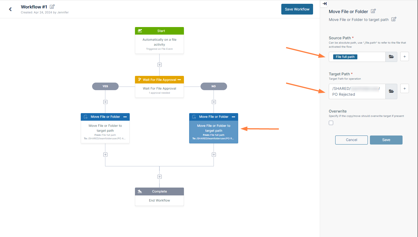 Since the next step is to move the approved file to the PO Approved folder, drag Move File or Folder from the right panel to the + below Yes. The Source Path is the file's current path, which is automatically entered as File full path.