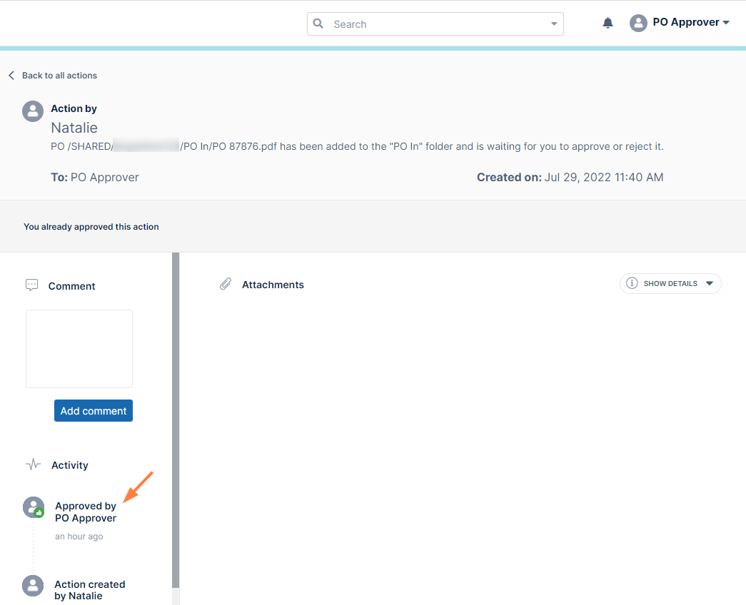 Go to your Team Folders and confirm that the file has been moved from PO In to PO Approved.