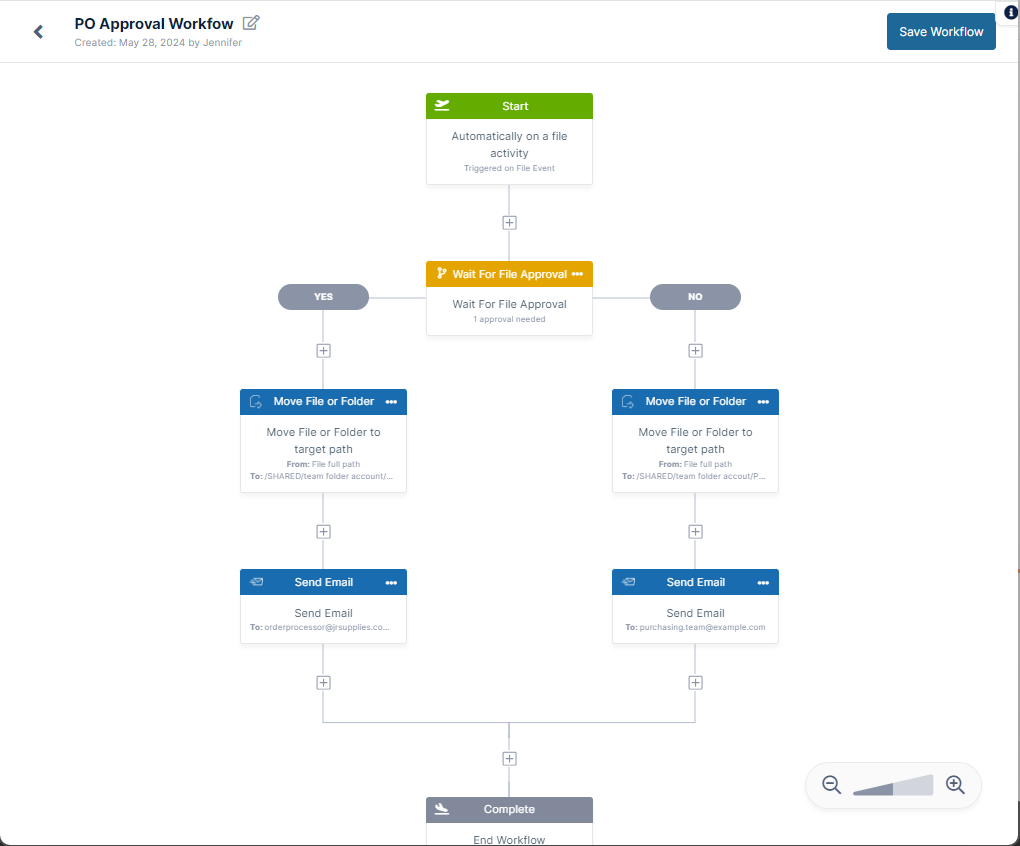 In the example, a company has a PO In folder, where employees can move purchase orders that they want approved. Once a new file is in the folder, the PO approver is sent a notification. The PO approver reviews the purchase order and approves it or rejects it.