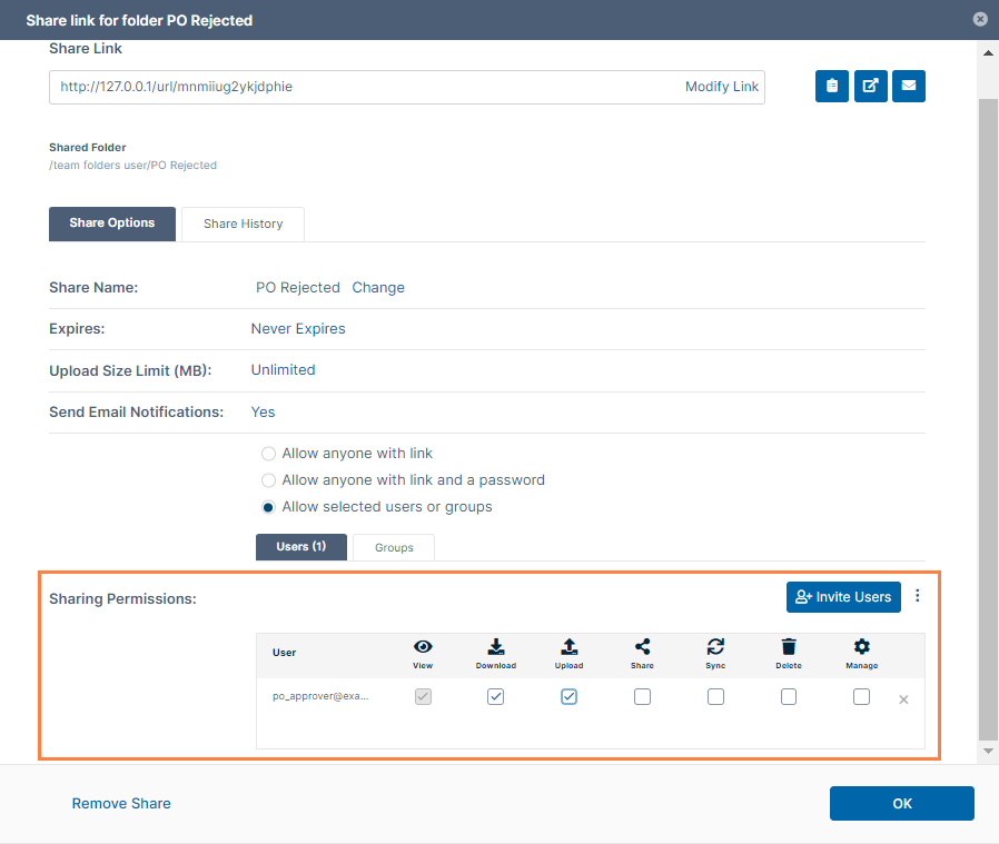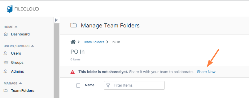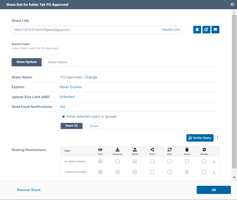 Log into the admin portal, and set up three Team Folders for purchase orders: PO In, PO Approved, and PO Rejected. Share the folders with the following users: