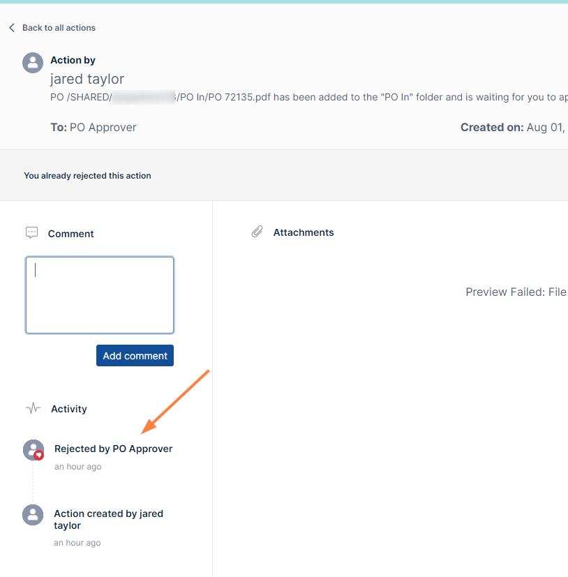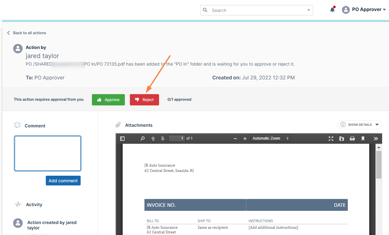 In the opened PO, click Reject. A pop-up should notify you that the file has been rejected, and you should see an action under Activity indicating that you have rejected the file: