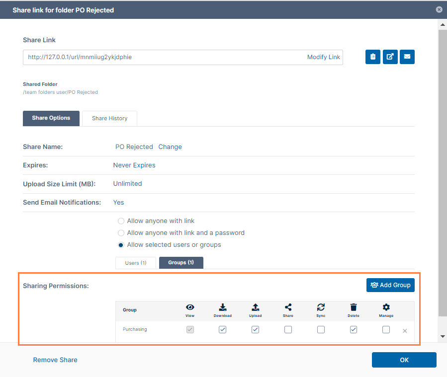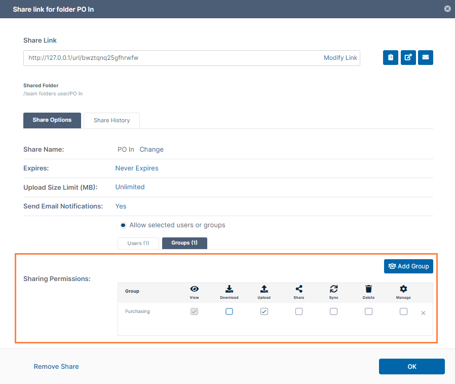 At minimum, give the members of the Purchasing team View, Download, Upload, and Delete access. The Purchasing user may want to download or delete the PO from the folder.