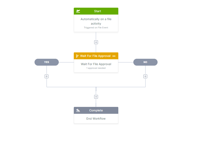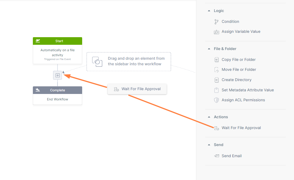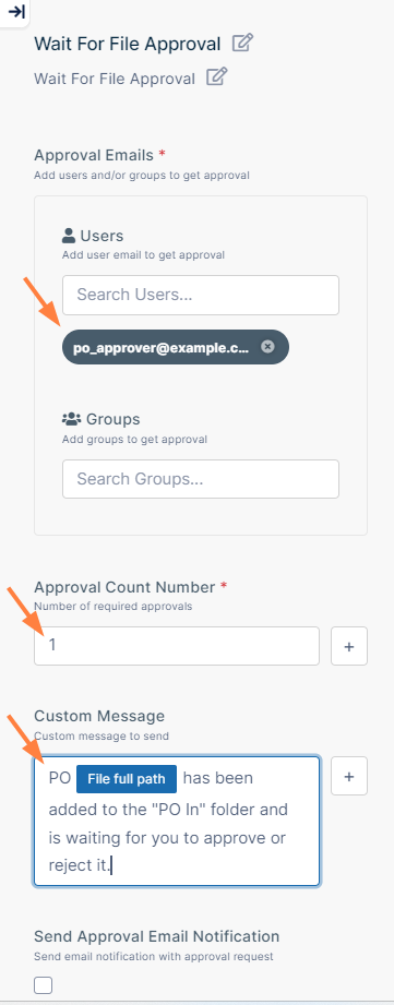 Drag and drop Wait for File Approval from the right panel to the + in your workflow. The Wait for File Approval workflow step continues in two directions, one if the file is approved and the other if it is not approved. It also sends a notification to the PO approver to let them know that a file is waiting for their action. The step requires that you fill in parameters that appear in the right panel.