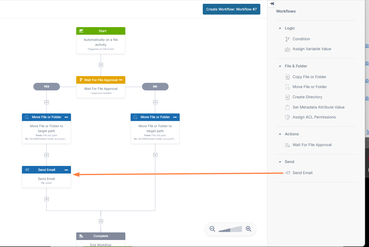 Next, drag and drop a Send Email step onto the + after the Move File step on the No side.