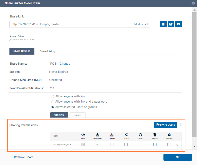 PO Approved - Share with your company's PO approver and with the vendor's order processor. At minimum, give the PO approver View and Upload access. Give the order processor at the vendor View, Download, Upload, and Delete access. The order processor may want to download or delete the PO from the folder.